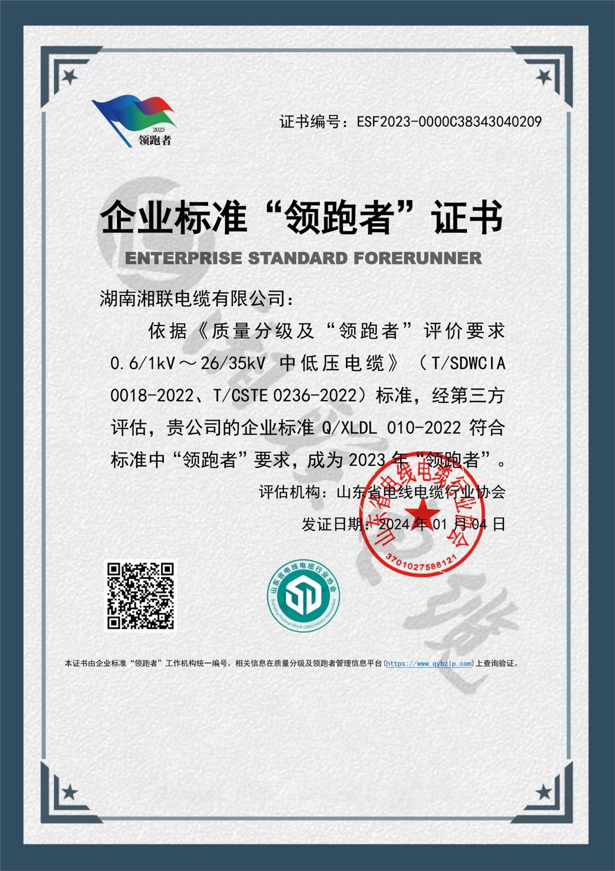 1月,企業(yè)標準領(lǐng)跑者管理信息平臺公布了2023年企業(yè)標準領(lǐng)跑者名單,湖南湘聯(lián)電纜有限公司憑借企業(yè)標準Q/XLDL 010-2022,成為2023年企業(yè)標準“領(lǐng)跑者”,湘聯(lián)電纜連續(xù)三年獲此殊榮。