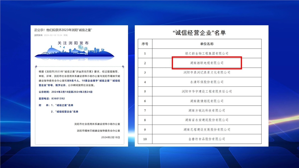2月,瀏陽市社會信用體系建設(shè)與瀏陽市精神文明建設(shè)指導委員會辦公室聯(lián)合開展的瀏陽市2023年“誠信之星”評選進行公示,湖南湘聯(lián)電纜有限公司成功入選,成為2023年“誠信之星”。