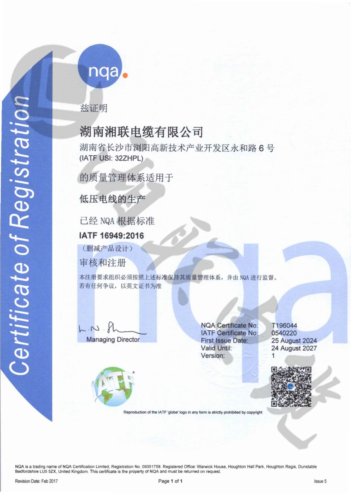 9月,湘聯(lián)電纜成功獲得了IATF16949:2016質(zhì)量管理體系認證。IATF 16949:2016標準是專為汽車行業(yè)設(shè)計的質(zhì)量管理體系標準,此項認證標志著湘聯(lián)電纜在質(zhì)量管理體系、產(chǎn)品品質(zhì)等方面均已滿足汽車行業(yè)的高質(zhì)量管理標準。