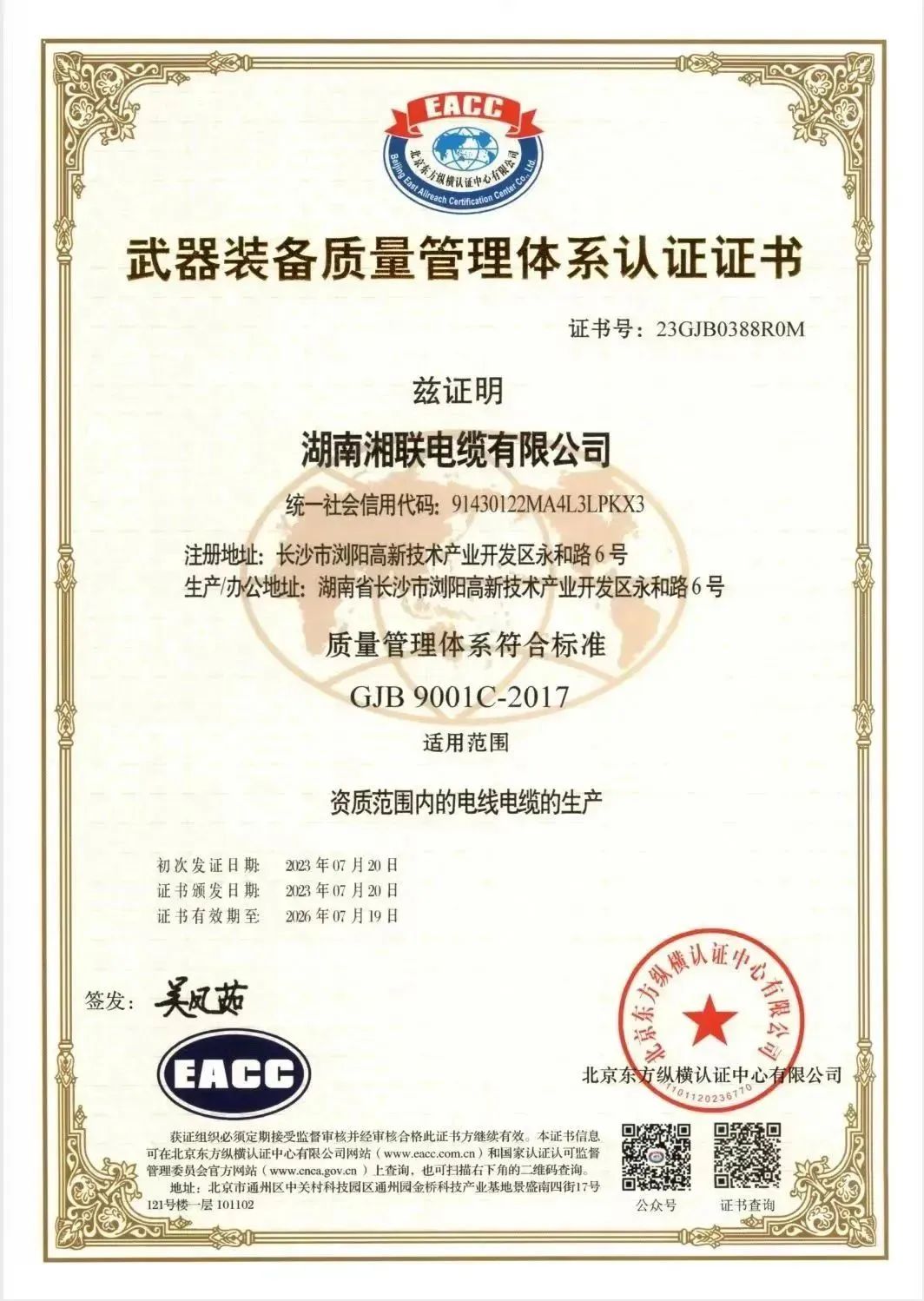 7月20日,湖南湘聯(lián)電纜有限公司順利通過(guò)國(guó)軍標(biāo)質(zhì)量管理體系認(rèn)證,獲得《武器裝備質(zhì)量管理體系認(rèn)證證書》,質(zhì)量管理體系符合:GJB9001C-2017標(biāo)準(zhǔn)。