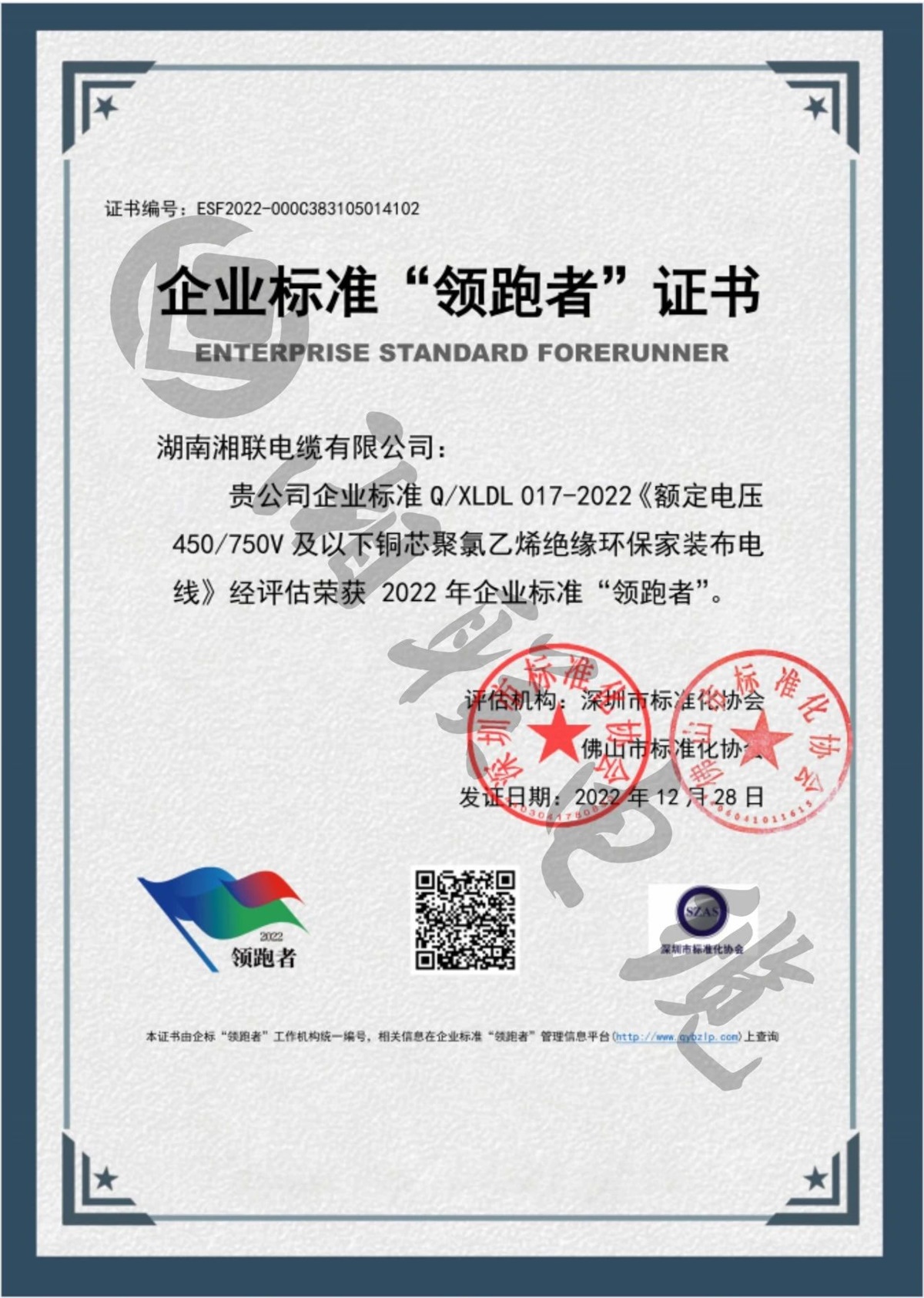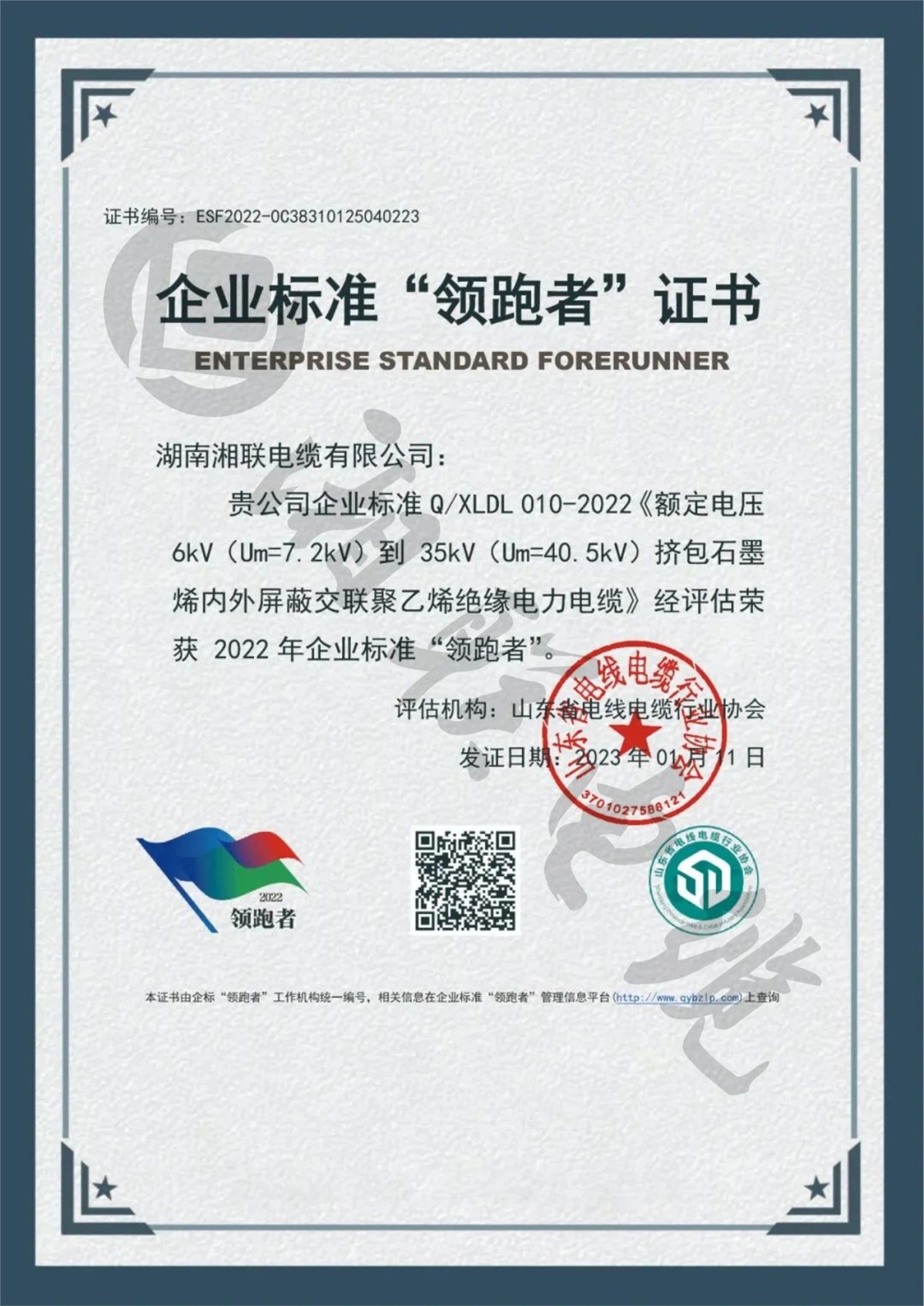 1月,湖南湘聯(lián)電纜有限公司三項企業(yè)標準經(jīng)評定,榮獲2022年全國企業(yè)標準“領跑者”。